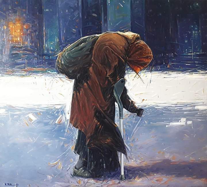 - لقد صنع الإنسان مدن ووضع لها أسس اجتماعية جعلته ينسلخ من كل القيم الإنسانية العليا ليصبح مثل دمية تبرمجها قوى خفية تتصارع يوميا على الوجود متجهة نحوى العدم. أجسام بالية متعبة تتراءى هنا و هناك بين أسوار المدينة في زواياها القاتمة، تبحث عن أقل ضرورة للبقاء ، أمام تلك المشاهد البائسة يأتي الفن كمحلل متوحش يكشف عيوب وأخطاء الإنسان في بنائه الحضاري و الاجتماعي، فيحدث صرخة تصعد مدوية من صدر الفنان الذي لا يعنيه بريق المدينة ولا بناياتها العجيبة وهو المتشبع بالقيم الإنسانية المثالية لتولد أعمال فنية معاصرة متسائلة عن مكانة الإنسان و كرامته في هذا العالم.