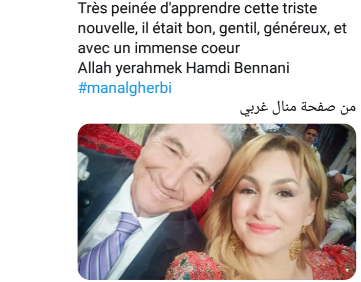 ونشرت الفنانة منال غربي صورة جمعتها بالراحل وكتبت: "حزينة جدا أنا لسماع خبر رحيل الفنان حمدي بناني، لقد كان جد لطيف وكريم. بقلب حزين الله يرحمك حمدي بناني".