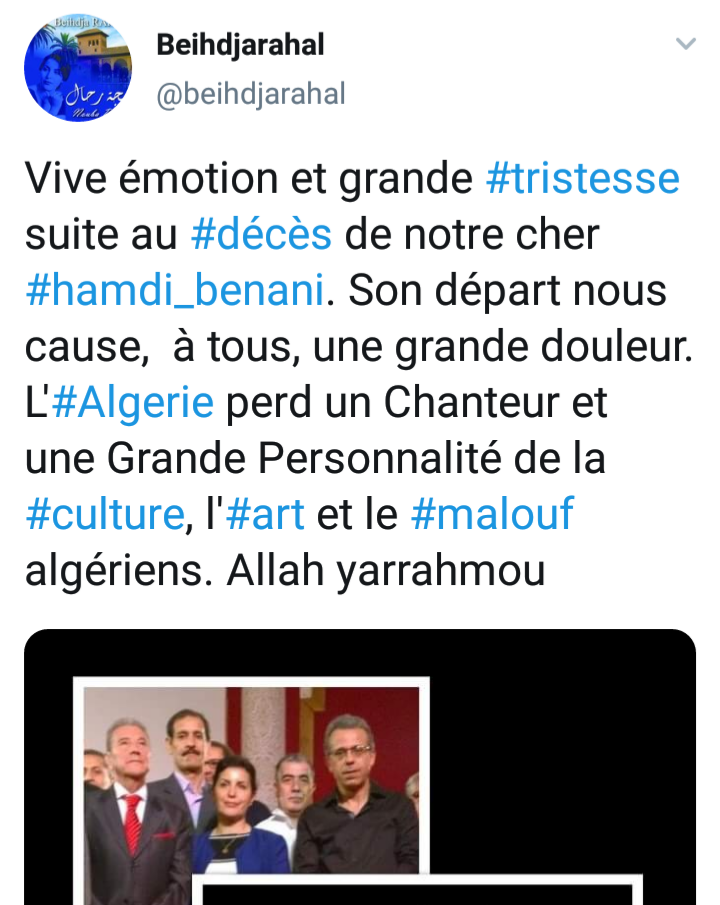 وبدورها نشرت الفنانة بهجة رحال، صورة جمعتها بحمدي بناني وكتبت: " شعور كبير بالحزن لرحيل العزيز حمدي بناني، رحيلك سبب لنا حزنا كبيرا. الجزائر فقدت مغنيا وشخصية كبيرة في الثقافة والفن والمالوف، الله يرحمو".