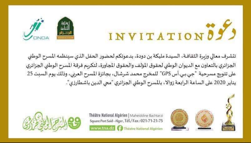 بعد حصولها على الجائزة الكبرى بمهرجان المسرح العربي بالأردن، وزارة الثقافة الجزائرية تقرر تكريم فريق مسرحية GPS لمخرجها محمد شرشال، هذا السبت 25 جانفي، بالمسرح الوطني محي الدين بشطارزي، بعد إعادة تقديم العرض.